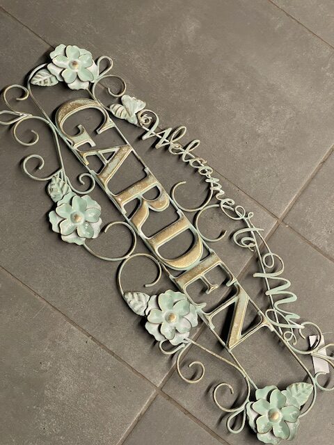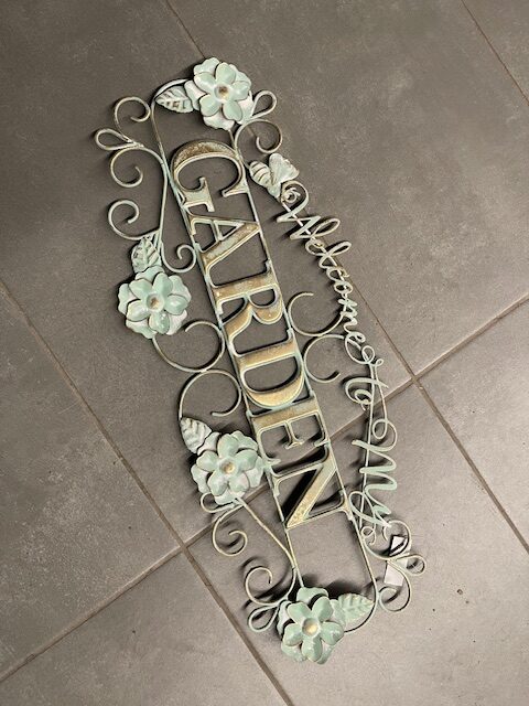 Soft green metal script sign with accent floral metal flowers; for home or garden.  Welcome to my Garden….